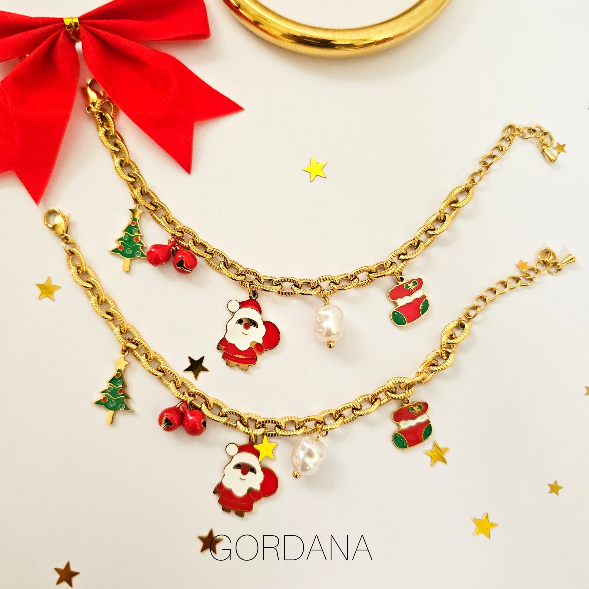 Spread holiday cheer all year round with our Christmas Bracelet! Featuring festive charms and pendants, this stainless steel and 18k gold plated piece is hypoallergenic, tarnish-free, durable, and waterproof. It's the perfect gift for a joyful Christmas, and the ideal accessory for any holiday outfit.