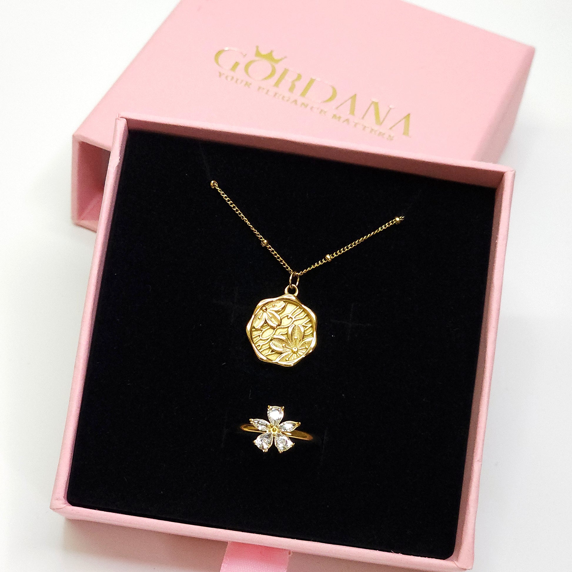 Get ready to blossom with our Sakura-inspired stainless steel set! This unique set includes a necklace and an adjustable ring with zircinia stones, both crafted with durable stainless steel and 18k gold plating. Perfect for daily wear and summer adventures. It's also water-resistant, hypoallergenic, and tarnish-free. Give the gift of beauty to a loved one today!